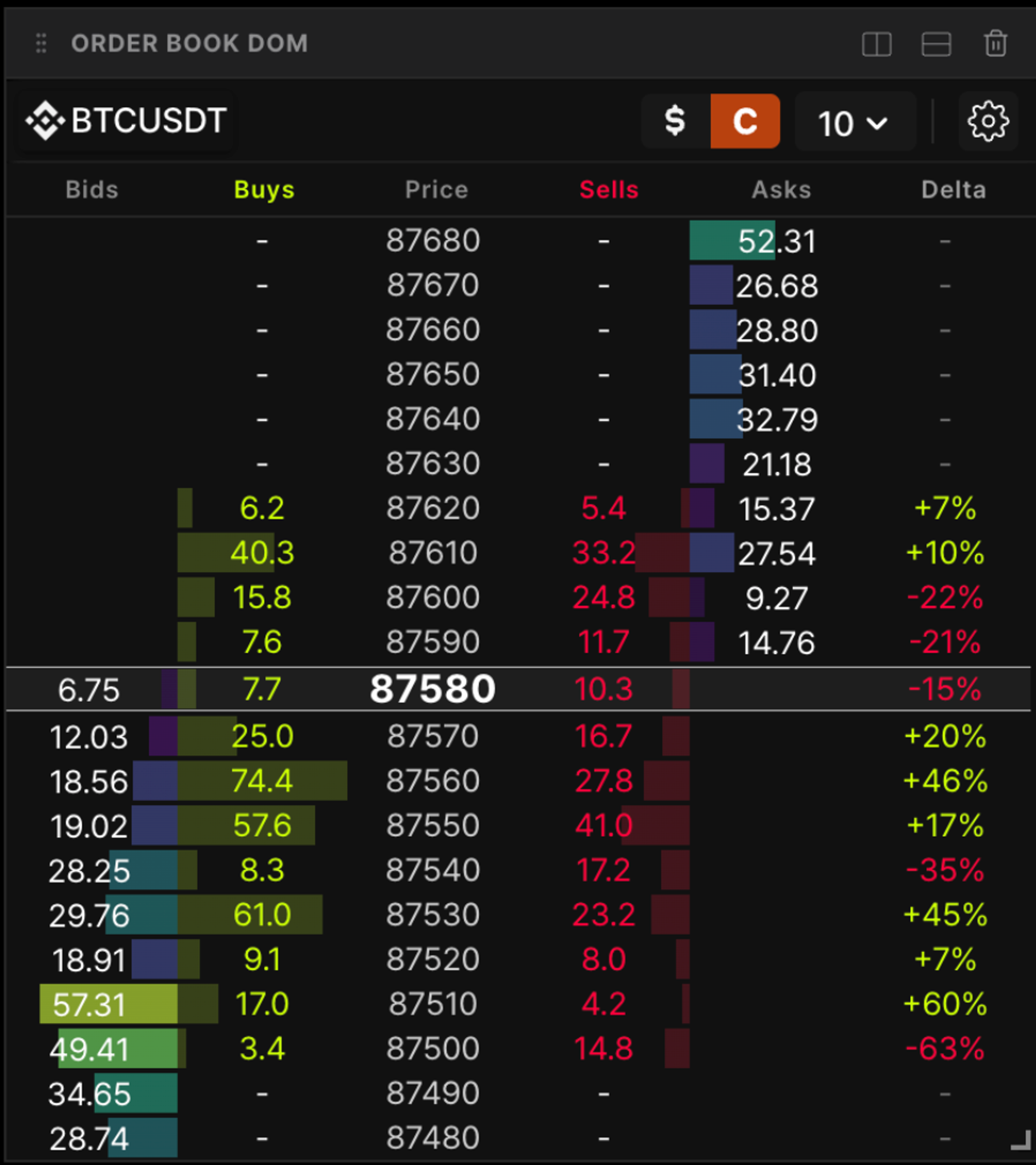 This second image shows the Order Book DOM, displaying raw order by order depth at each price level. It highlights bid and ask quantities, revealing buying vs. selling pressure, delta imbalances, and aggressive activity (in both directions) near the current price. This view is ideal for scalping, spotting spoofing or aggressive absorption, and taking accurate real-time decisions - a true micro, pro-trader focused view.