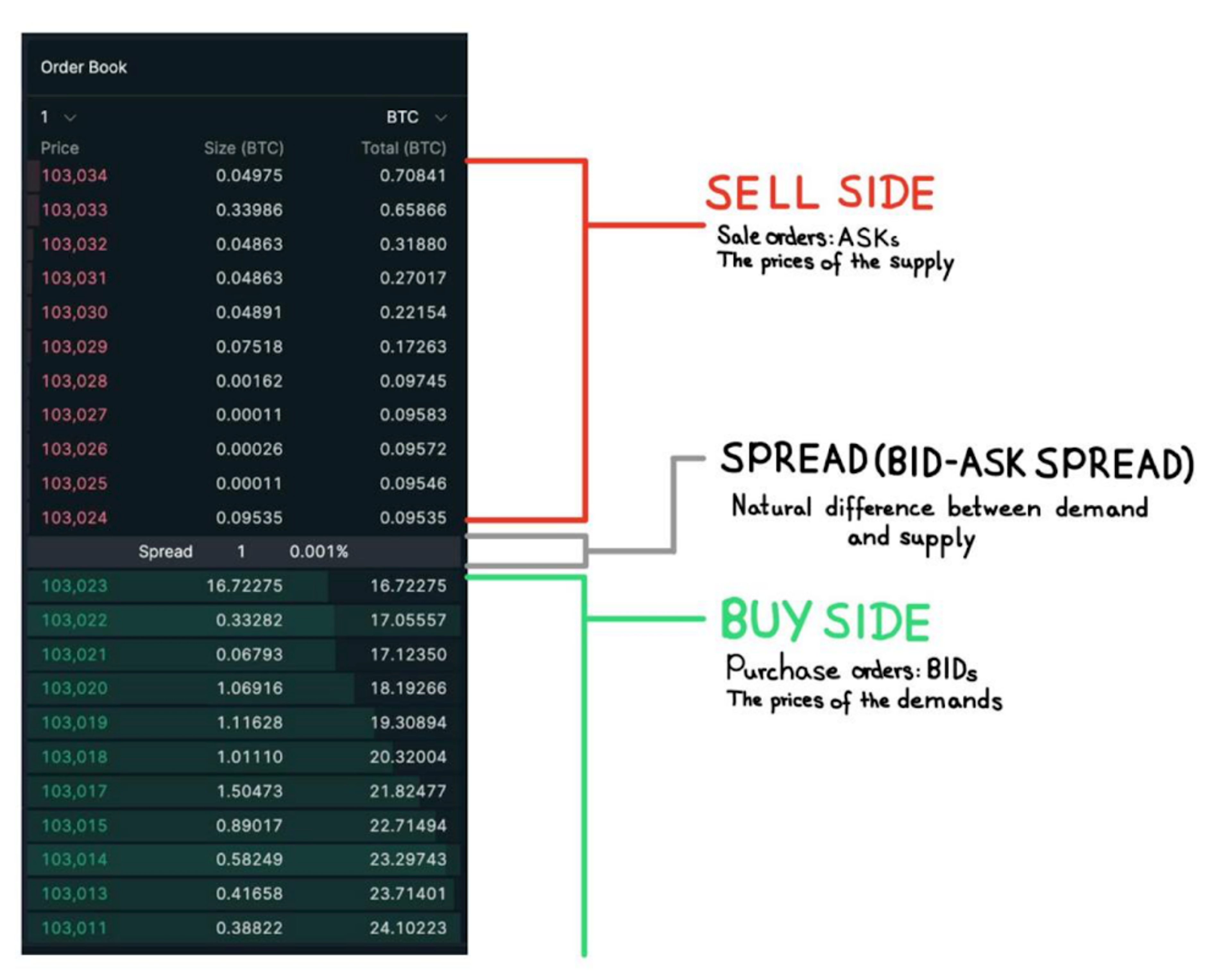 - Spread: the difference between the best bid (highest buyer) and the best ask (lowest seller), represents the immediate transactional cost of trading. Tight spreads indicate a highly competitive market with many active participants.